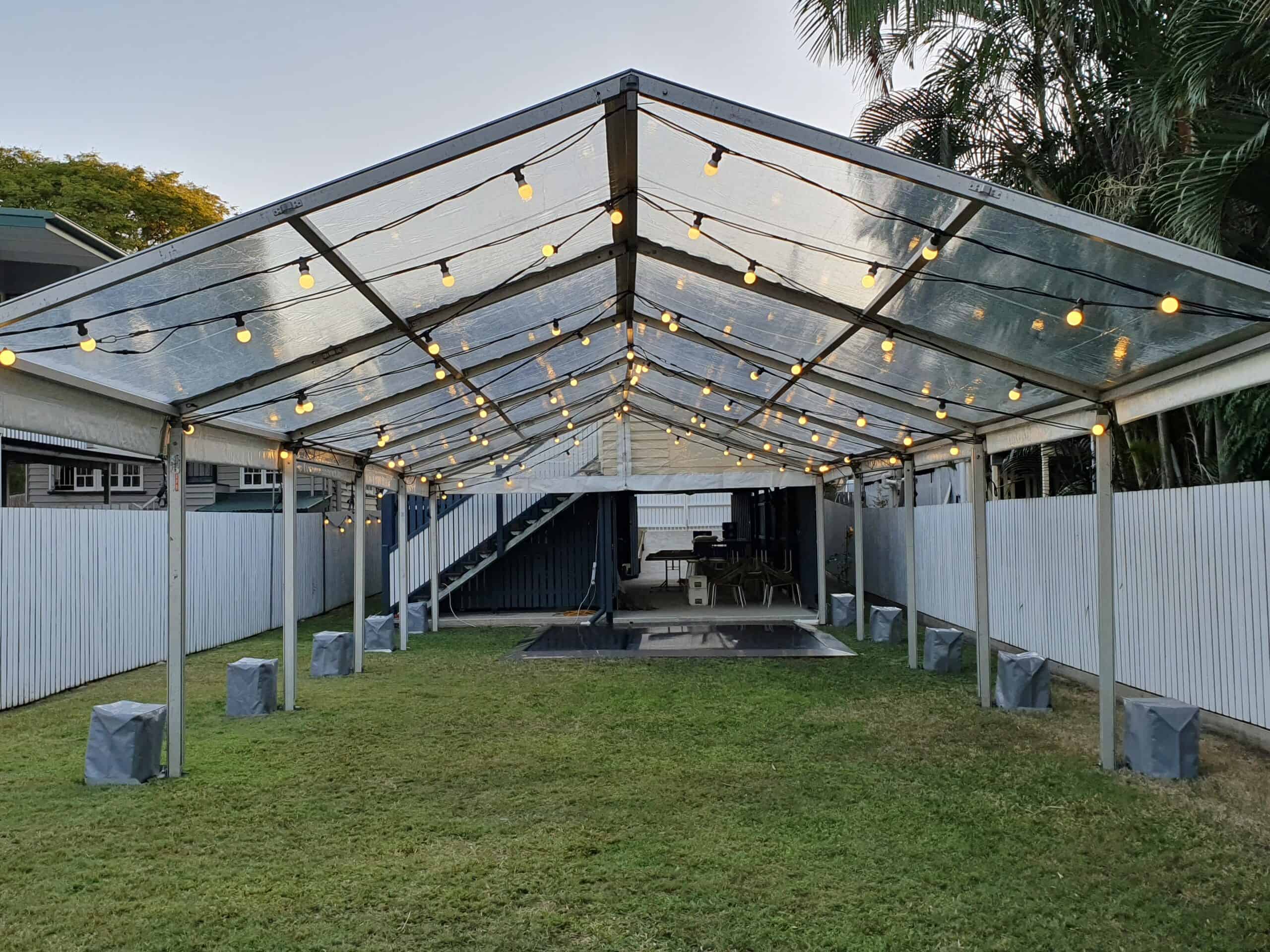 A clear pavilion tent with fairy lights set up on a grassy area.